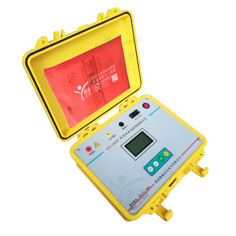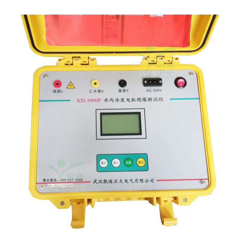 KD5000F水冷發(fā)電機(jī)絕緣電阻測(cè)試儀專(zhuān)用于水內(nèi)冷發(fā)電機(jī)的絕緣測(cè)量試驗(yàn),同時(shí)也可用于試驗(yàn)室或現(xiàn)場(chǎng)做其它材料的絕緣測(cè)試,輸出電流大于40mA。輸出電壓最大5000V,可測(cè)高達(dá)100GΩ的絕緣電阻。內(nèi)含高精度微電流測(cè)量系統(tǒng)、數(shù)字升壓系統(tǒng)。只需要用一條高壓線和一條信號(hào)線連接試品即可測(cè)量。測(cè)量自動(dòng)進(jìn)行,結(jié)果由大屏幕液晶顯示,并將結(jié)果進(jìn)行存儲(chǔ)。不需對(duì)水極化電勢(shì)進(jìn)行補(bǔ)償調(diào)節(jié),機(jī)座與匯水管間的電阻小至3kΩ,也可保證測(cè)量準(zhǔn)確度,水阻大于80kΩ時(shí),可保證測(cè)試準(zhǔn)確度。并自動(dòng)計(jì)算吸收比(R60S/R15S)和極化指數(shù)(R10min/R1min),自動(dòng)儲(chǔ)存15秒、1分鐘、10分鐘的絕緣電阻值。也可用于變壓器等其他電力設(shè)備的絕緣電阻測(cè)試。