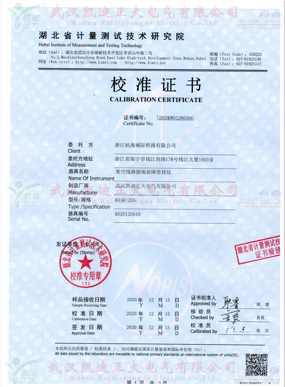 KDJK-20A架空線路接地故障查找儀獲得湖北計量院校準(zhǔn)證書