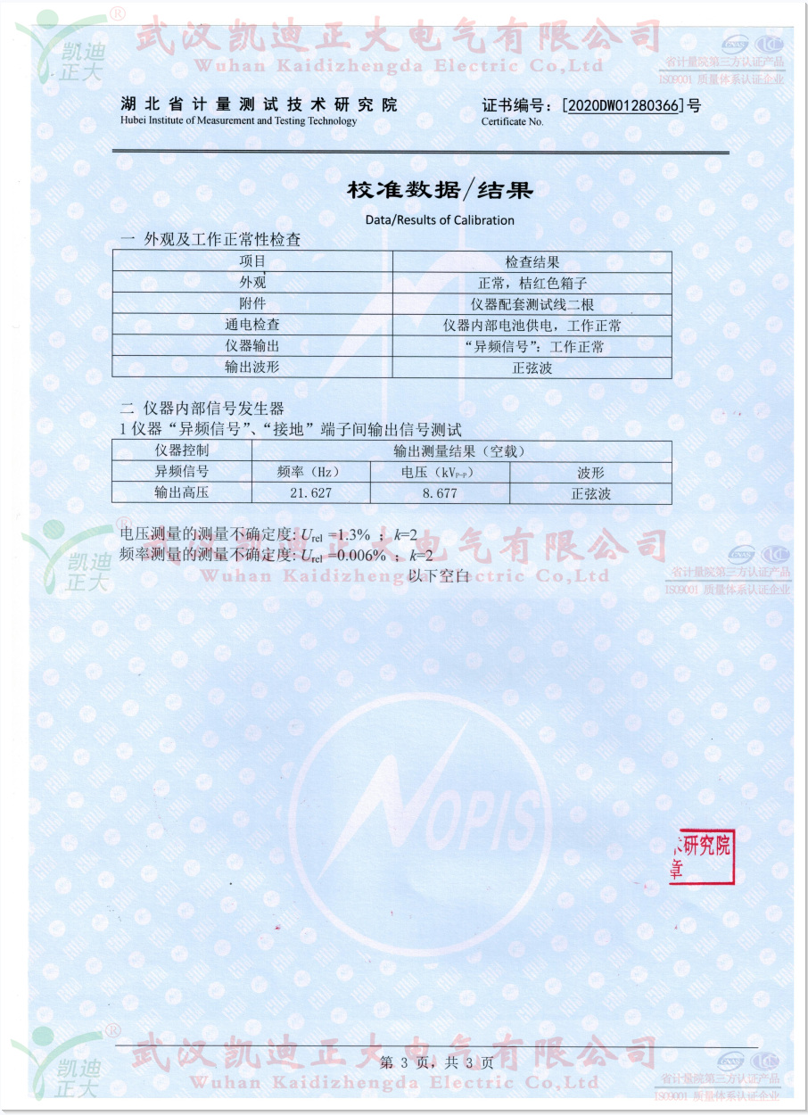 繼我司抽檢10套KDJK-10A配網(wǎng)單相接地故障定位儀送往湖北省計量測試技術(shù)研究院校準(zhǔn),此次獲得電學(xué)所檢測設(shè)備DS0S054A數(shù)字示波器標(biāo)準(zhǔn)設(shè)備的數(shù)據(jù):輸出波形正玄波、異頻信號21.627Hz、輸出電壓8.677kV、頻率測量的不確定度0.006%。符合武漢凱迪正大公司和國家電力規(guī)程標(biāo)準(zhǔn)。同時獲得科學(xué)技術(shù)部火炬高技術(shù)產(chǎn)業(yè)開發(fā)中心、武漢市科技局認(rèn)定武漢市創(chuàng)新產(chǎn)品證書。