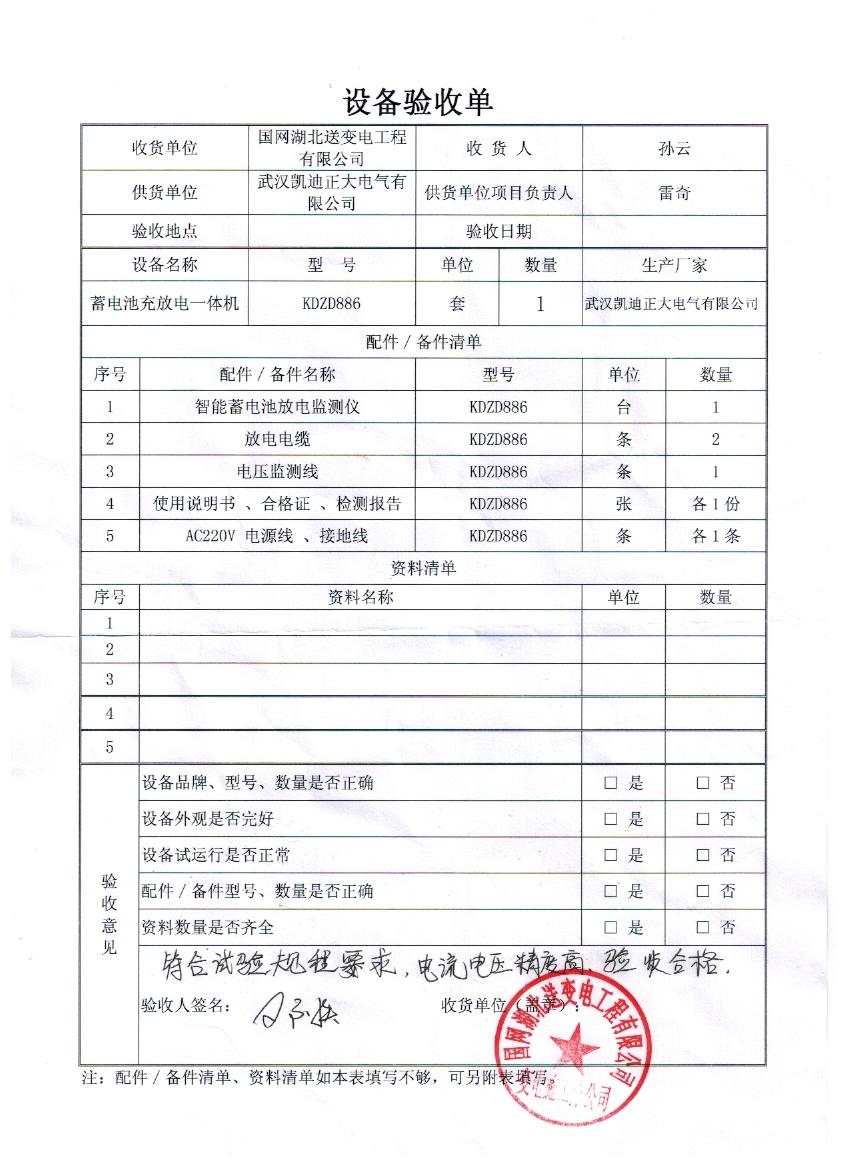就在前幾日國(guó)網(wǎng)湖北送變工程有限公司采供了我司KDZD886蓄電池充放電一體機(jī)一套,并且驗(yàn)收成功,驗(yàn)收結(jié)果也達(dá)到試驗(yàn)規(guī)程要求,電流電壓精度都很高,驗(yàn)收結(jié)果表示很滿意!KDZD886蓄電池充放電一體機(jī)主要配件有KDZD886智能蓄電池檢測(cè)儀1臺(tái),KDZD886放電電纜2條,KDZD886電壓檢測(cè)線1條,使用說明書,合格正,檢測(cè)報(bào)告各一份,KDZD886 AC220V電源線,接地線各一條,湖北省送變電工程公司是湖北省電力公司的合資子公司,隸屬于國(guó)家電網(wǎng)公司,是一家從事輸變電工程施工的省級(jí)專業(yè)公司,具有國(guó)家電力工程施工總承包壹級(jí)企業(yè)資質(zhì)和一級(jí)承裝(修、試)電力設(shè)施許可證;通過了國(guó)家質(zhì)量管理體系、環(huán)境管理體系和職業(yè)健康安全管理體系的認(rèn)證?,F(xiàn)有職工2076人,具有中高級(jí)專業(yè)技術(shù)資格人員219人。