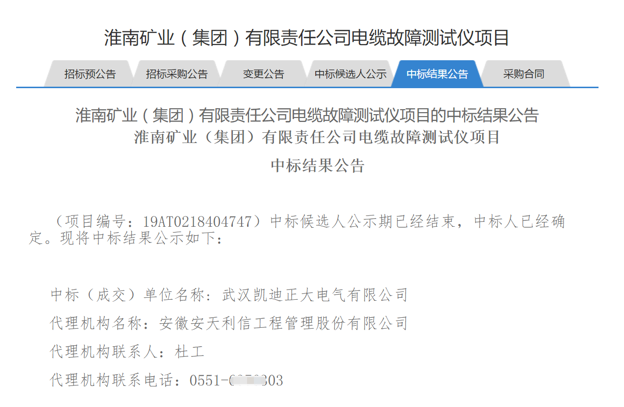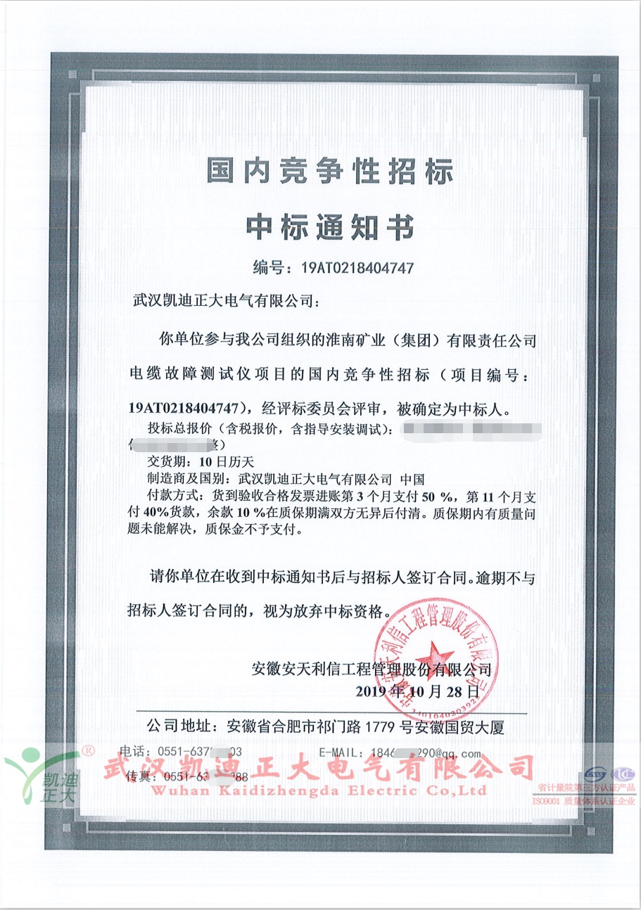金九銀十,黃金節(jié)。武漢凱迪正大電氣公司參與淮南礦業(yè)(集團)有限責任公司電纜故障測試儀項目投標,在經(jīng)過嚴正的評標,最終確認武漢凱迪正大電氣有限公司為第一中標人。