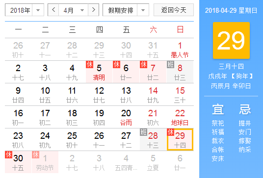 2018年五一放假安排時間表最新國務(wù)院官方發(fā)布: 4月29日(星期天)至5月1日(勞動節(jié),星期二)放假調(diào)休,共3天。 友情提示:4月28日(星期六)上班。