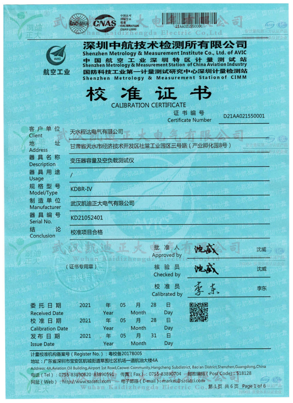 KDBR-IV變壓器容量及特性測試儀是我司老客戶天水程達電氣再次采購的,因多次為質(zhì)檢所等相關(guān)單位提供高低壓成套檢測設備,所以程達電氣對我司產(chǎn)品青睞。應要求需要出具中國合格評定國家認可委員會(CNAS)相關(guān)單位的電壓示值校準、電流示值校準、功率示值校準等數(shù)據(jù)。深圳中航技術(shù)檢測大多數(shù)限公司(中國航空工業(yè)深圳特區(qū)計量測試站/國防科技工業(yè)第一計量測試研究中心深圳計量檢測站 )是航空工業(yè)北京長城計量測試技術(shù)研究所、國防科技工業(yè)第一計量測試研究中心于1986年投資建立的計量技術(shù)檢測服務機構(gòu),是深圳市最早的法定計量檢測機構(gòu)之一,是具有法定計量、國防計量、軍用計量屬性的第三方公正實驗室。
