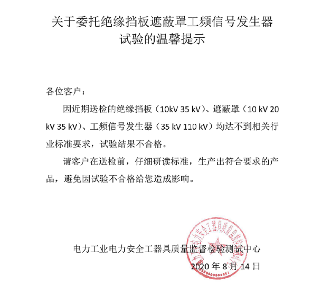 國家檢測中心是代表電力行業(yè)的權(quán)威質(zhì)量監(jiān)督檢驗(yàn)測試機(jī)構(gòu),具有社會(huì)第三方的公正地位。需要獲得國家技術(shù)監(jiān)督局頒發(fā)的《計(jì)量認(rèn)證合格證書》,才能認(rèn)定檢測產(chǎn)品包括:攜帶型短路接地線、電容型驗(yàn)電器、安全帶、安全帽、遮蔽罩、絕緣隔板、登桿腳扣、絕緣硬梯、電絕緣橡膠板、絕緣墊、絕緣手套、絕緣鞋(靴)、高壓帶電顯示裝置、防墜落裝置、緩沖器、鋼絲繩吊索、纖維繩吊索、吊裝帶、手拉葫蘆等共計(jì)59大類260個(gè)檢測項(xiàng)目/參數(shù),此外還承接近電報(bào)警器、帶電指示器、驗(yàn)電器信號發(fā)生器、高壓拉閘桿、登高板、絕緣繩等產(chǎn)品的檢測。