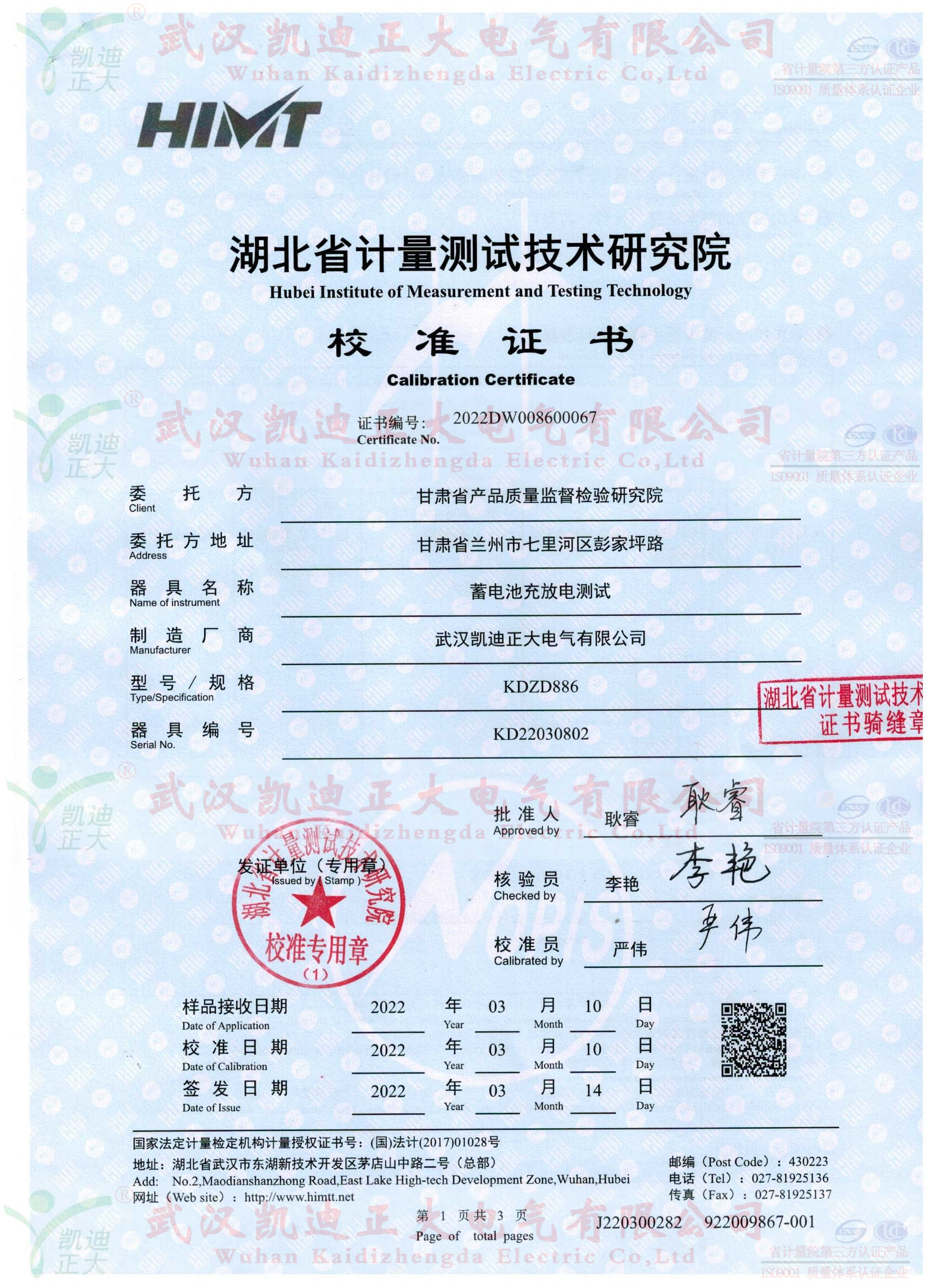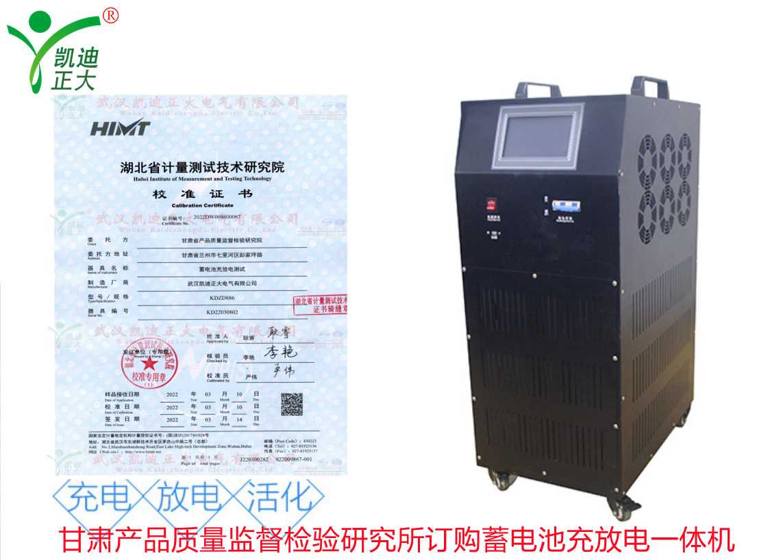 甘肅省產(chǎn)品質(zhì)量監(jiān)督檢驗研究院在了解我司KDZD886蓄電池充放電測試儀集蓄電池恒流放電,智能充電,活化于一體等功能。隨即采購KDZD886蓄電池充放電測試儀,要求獲得湖北省計量測試技術(shù)研究院的檢定合格報告。
