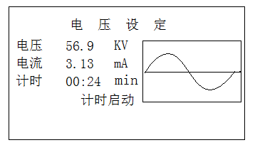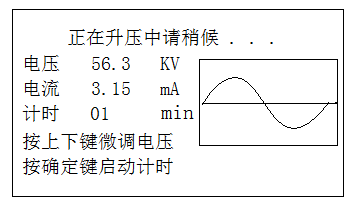 自檢成功后,儀器自動(dòng)進(jìn)入升壓狀態(tài)。儀器將用若干個(gè)周期的時(shí)間(幾分鐘)將電壓升至設(shè)定值。在升壓過程中,按停機(jī)鍵,儀器將切斷電壓輸出,回到開始畫面。當(dāng)升壓值接近設(shè)定值時(shí)出現(xiàn)圖7