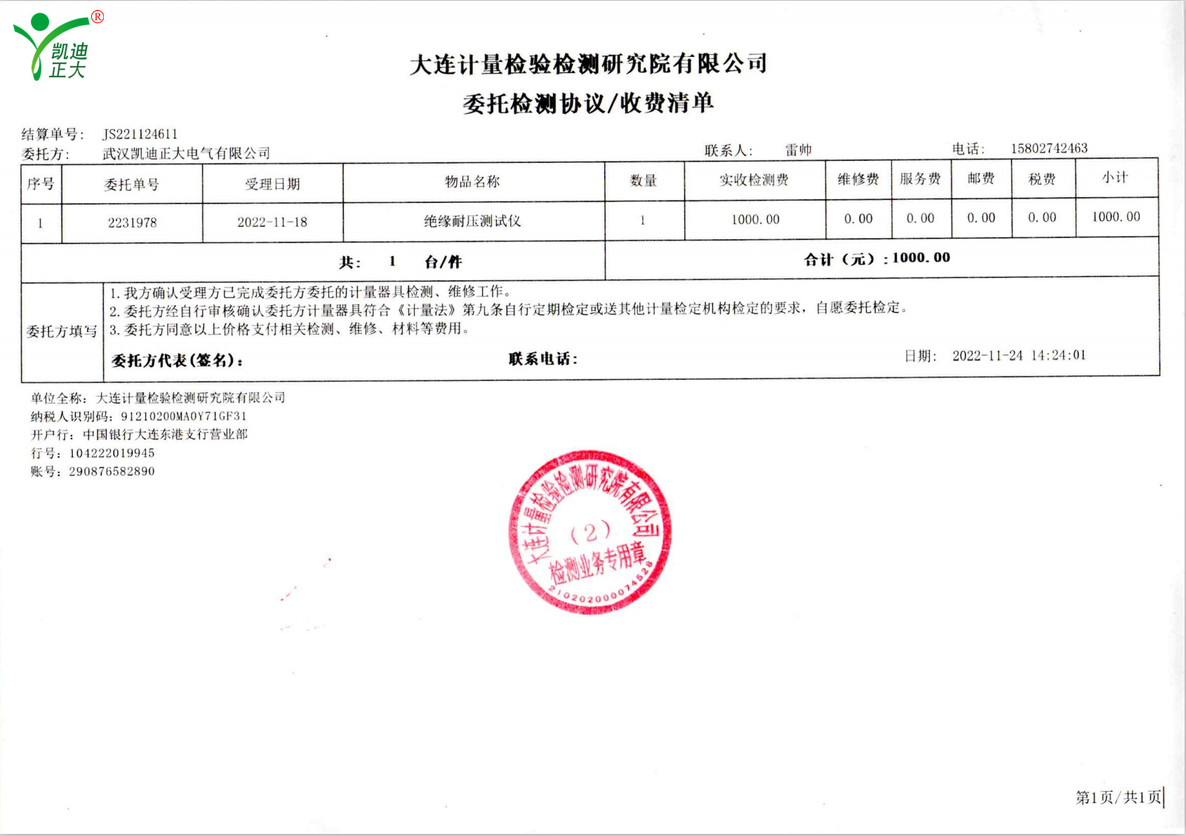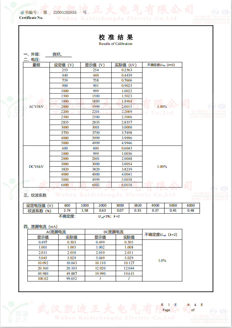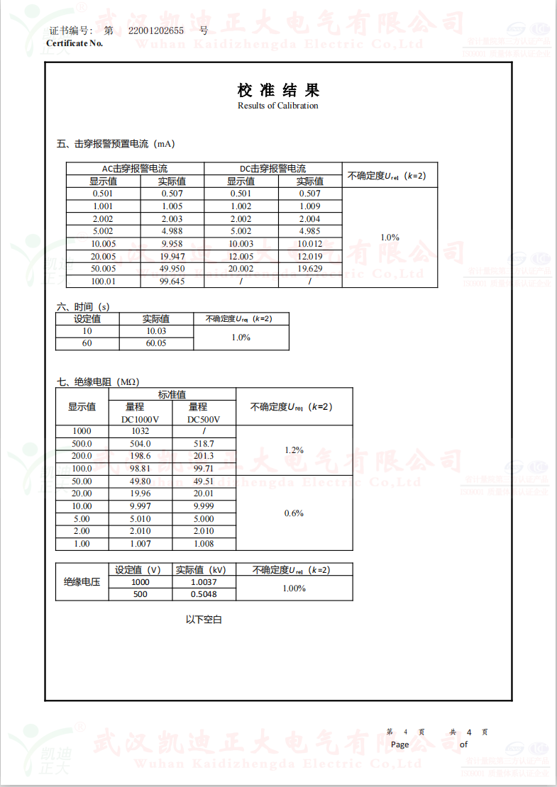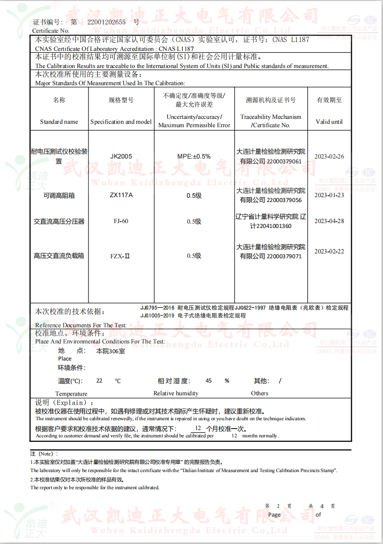 低壓成套開關(guān)柜KD7742智能耐壓絕緣測試儀根據(jù)公司制度標(biāo)準(zhǔn)需要獲得中國認(rèn)可國際互認(rèn)校準(zhǔn)CNAS檢定機(jī)構(gòu),大連計(jì)量檢驗(yàn)檢測研究院有限公司出具《KD7742智能耐壓絕緣測試儀校準(zhǔn)證書》,證書編號:第22001202655號;使用耐電壓測試儀校驗(yàn)裝置(溯源機(jī)構(gòu)大連計(jì)量檢驗(yàn)檢測研究院)、ZX117A可調(diào)高阻箱(溯源機(jī)構(gòu)大連計(jì)量檢驗(yàn)檢測研究院)、FJ-60交直流高壓分壓器(溯源遼寧省計(jì)量科學(xué)研究院)、FZX-II高壓交直流負(fù)載箱(溯源機(jī)構(gòu)大連計(jì)量檢驗(yàn)檢測研究院)等檢定設(shè)備。