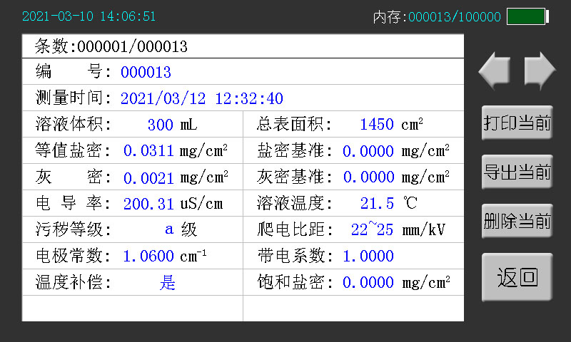 鹽密基準(zhǔn)值:在測(cè)量頁(yè)點(diǎn)“校準(zhǔn)”按鈕后會(huì)自動(dòng)保存溶液的初始鹽密值作為“鹽密基準(zhǔn)值”,也可以用戶(hù)自定義。