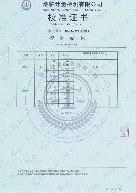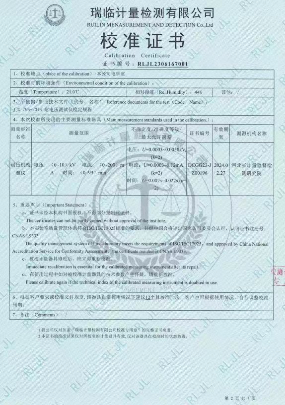 參照J(rèn)JG 795-2016 耐電壓測(cè)試儀檢定規(guī)程檢定要求,KDYD2675 工頻高壓測(cè)試臺(tái)獲得證書RLJL2306167001檢定證書。