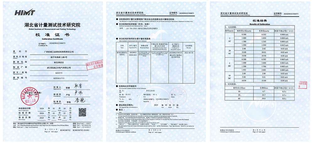 2024年1月25日,廣西機(jī)械工業(yè)研究院有限責(zé)任公司成功采購了凱迪正大電氣的KD305A 絕緣電阻測試儀、KD2575 耐壓測試儀、KD2678 30A接地電阻測試儀、KDGK-F 開關(guān)特性測試儀等電力儀器儀表,均通過權(quán)威的湖北省計(jì)量測試技術(shù)研究院的嚴(yán)格校準(zhǔn)。