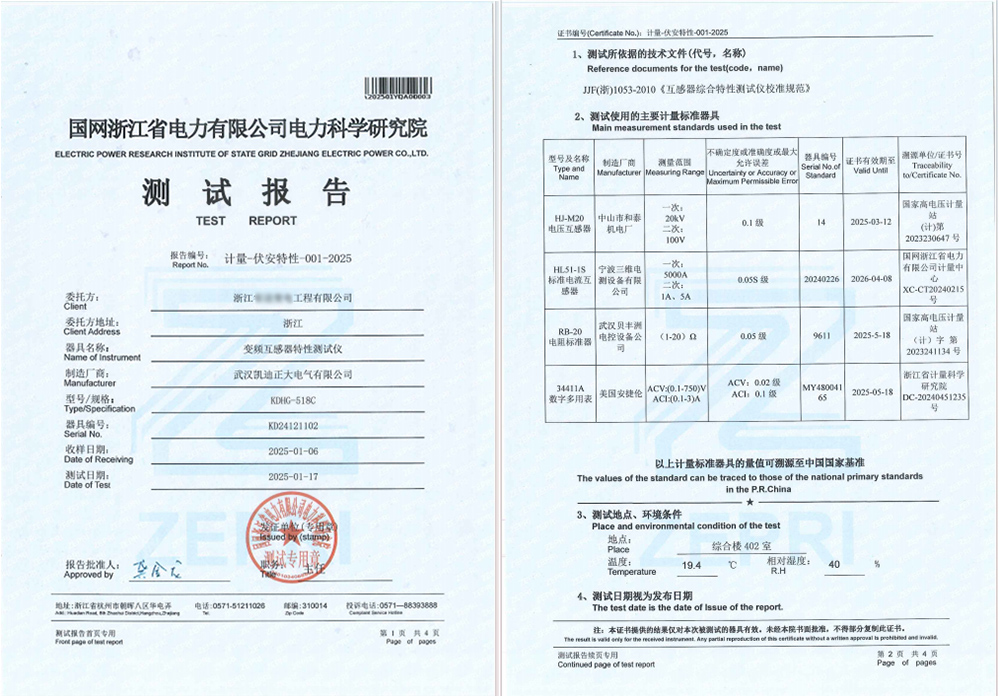 校準(zhǔn)圍繞對(duì)儀器的變比精度、角差控制、伏安特性曲線擬合度等核心指標(biāo)進(jìn)行了多場(chǎng)景模擬測(cè)試。KDHG-518C變頻互感器特性測(cè)試儀具有操作簡(jiǎn)便、功能全面、測(cè)試精準(zhǔn)等特點(diǎn),廣泛應(yīng)用于各類CT(電流互感器)和PT(電壓互感器)的性能測(cè)試。此次通過(guò)國(guó)網(wǎng)浙江省電力有限公司電力科學(xué)研究院的校準(zhǔn),充分證明了KDHG-518C在技術(shù)指標(biāo)、測(cè)試精度和穩(wěn)定性等方面的可靠表現(xiàn)。