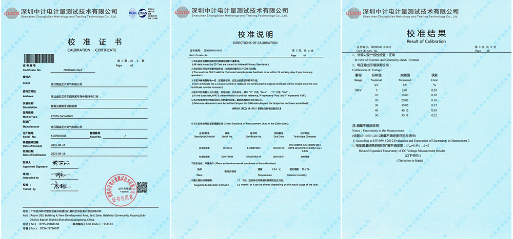 近日,武漢凱迪正大電氣有限公司生產(chǎn)的KDYDJ-5kVA50kV智能工頻耐壓試驗裝置,通過深圳中計電計量測試技術(shù)有限公司的校準(zhǔn)測試。此次校準(zhǔn)驗證了產(chǎn)品的性能,特別是輸出電壓的準(zhǔn)確性和穩(wěn)定性。