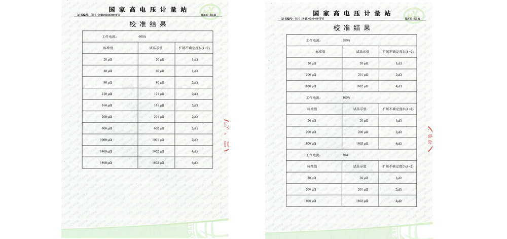 在校準(zhǔn)過程中,國(guó)家高電壓計(jì)量站采用了最大充許誤差為±0.1%讀數(shù)的直流大功率標(biāo)準(zhǔn)電阻作為校準(zhǔn)器具,校準(zhǔn)環(huán)境為溫度21℃℃、濕度56%RH。校準(zhǔn)內(nèi)容包括對(duì)測(cè)試儀在600A、200A、100A、50A不同電流下的測(cè)量結(jié)果。經(jīng)過一系列嚴(yán)格的測(cè)試和比對(duì),KDHL-600A回路電阻測(cè)試儀成功通過了校準(zhǔn)。