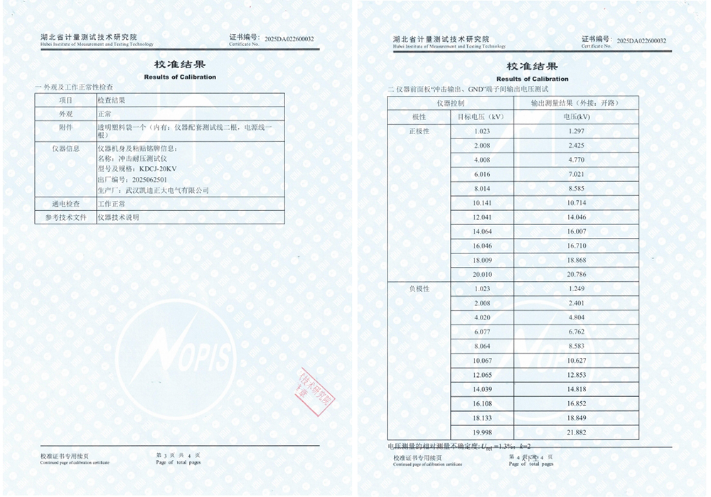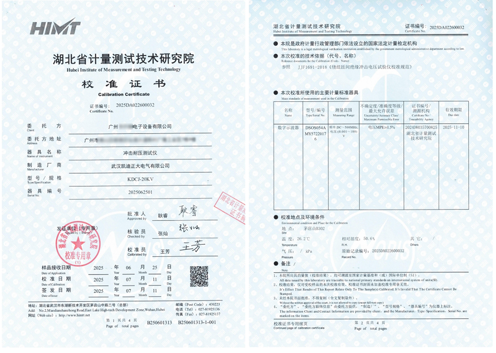 2025年7月11日,廣州某電子設備有限公司向武漢凱迪正大電氣采購的KDCJ-20kV沖擊耐壓測試儀,通過湖北省計量測試技術研究院的專業(yè)校準,驗證了測試儀的準確性和可靠性。