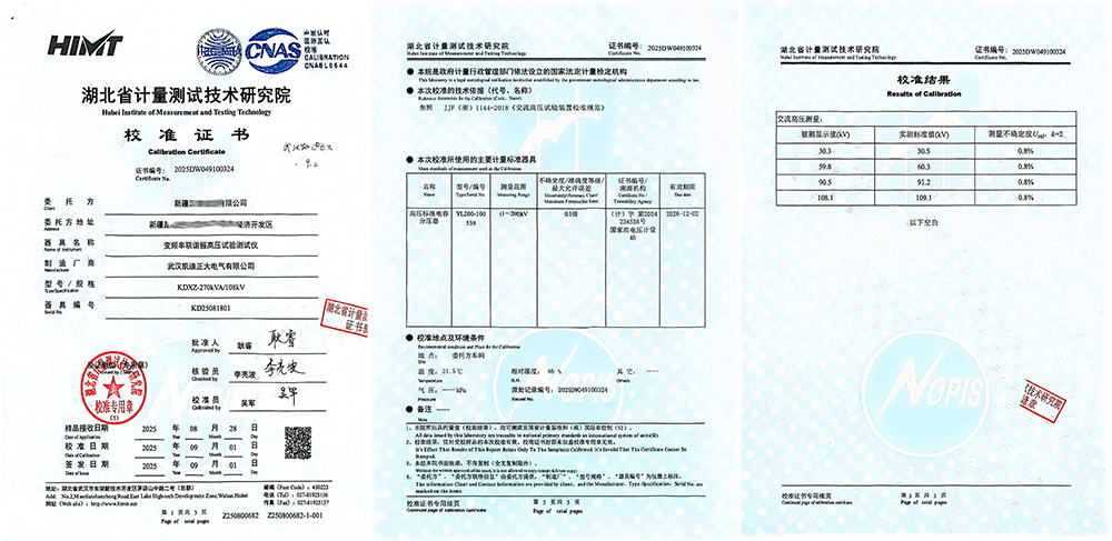 近期,新疆某能源公司采購(gòu)了由武漢凱迪正大電氣有限公司生產(chǎn)的KDXZ-270kVA/108kV變頻串聯(lián)諧振試驗(yàn)裝置。該設(shè)備經(jīng)湖北省計(jì)量測(cè)試技術(shù)研究院(省計(jì)量院)校準(zhǔn)并頒發(fā)證書(shū)(證書(shū)編號(hào):2025DW049100324),此次校準(zhǔn)不僅標(biāo)志著該設(shè)備各項(xiàng)性能指標(biāo)符合行業(yè)規(guī)范要求,更凸顯了武漢凱迪正大在高壓電氣檢測(cè)設(shè)備領(lǐng)域的技術(shù)實(shí)力。